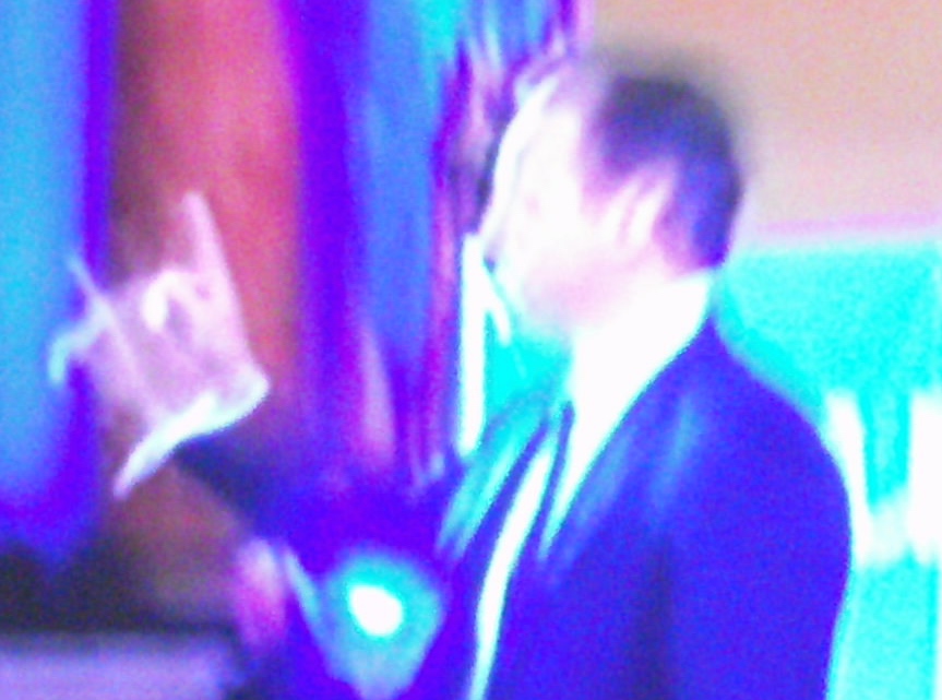 Och pappan och sonen stod kvar med oss och tittade på med sitt inre lugn och nästa kolonn bilar dök upp och kameramannen som alltså var mitt i språnget hela tiden, blev ännu mera så . Och det var verkligen Ed Miliband som anlände, och steg ur bilen och gick uppför trappan, och med ens började labourmannen hojta, helt som en förryckt! Han viftade med armarna, och det var helt oväntat för oss, och han ropade och skrek att Miliband! Here! Here! Och Miliband vände sig visserligen om och vinkade, men även för labourmannen var han ju långt borta, kanske tio meter bort och tjugo, trettio trappsteg upp redan, och stannade gjorde han inte ens för ett ögonblick och han var borta. Miliband var borta direkt.