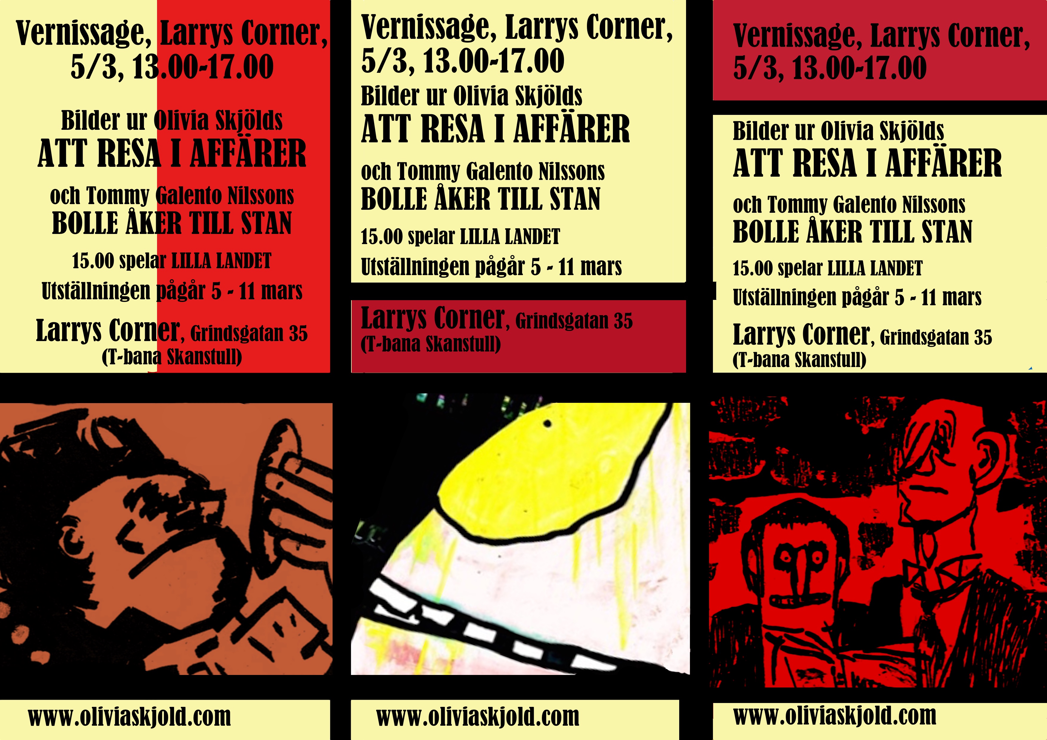 Från och med den femte mars ställer OLIVIA SKJÖLD ut bilder från seriealbumet ATT RESA I AFFÄRER – boken som alltså ”innehåller allt du behöver för att lyckas som handelsresande på ett främmande språk” – på LARRYS CORNER.